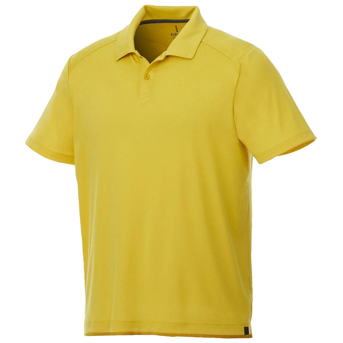 Think outside the box with a custom eco-friendly Elevate Men’s Gold Amos Eco Short Sleeve Polo. This classically styled short sleeve polo has some earth friendly secrets with the 100% recycled polyester and a one of a kind look. Add a custom logo to the polo with asymmetric seaming details and side slits for ventilation to use as a custom gift. Try a company logo to use as employee apparel that is wash and wear, anti-pill, snag resistant, offers UPF protection, has moisture wicking, and feels like soft cotton. Who could ask for more from a simple polo?