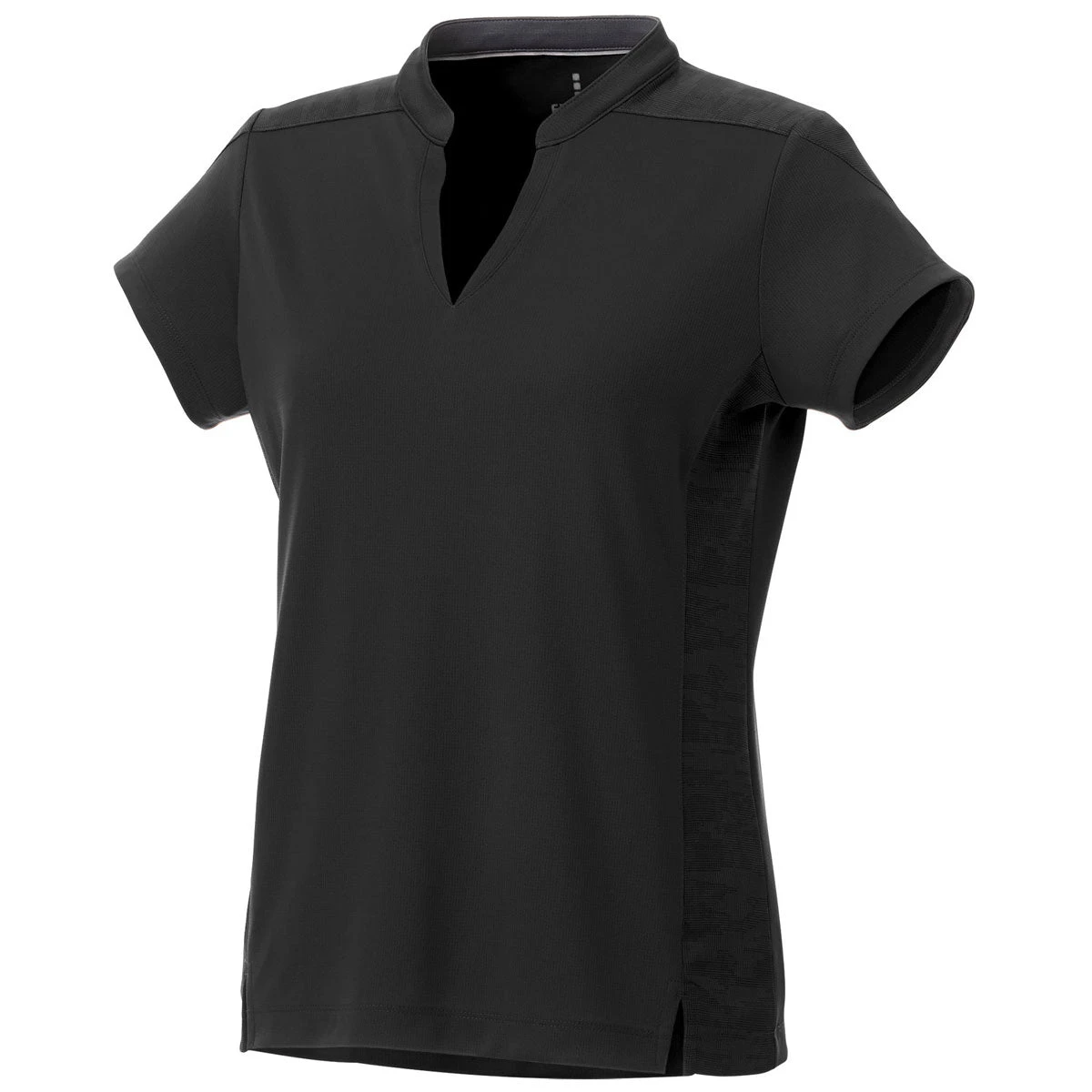 Add a custom logo to the Elevate Women’s Black Piedmont Short Sleeve Polo that has a subtle graphic and reflective details. This stylish polo offers a hidden button placket, shaped seams, a tapered waist, and sleek stand collar for a silhouette that any woman can love. Don’t let the details fool you, this polo also offers moisture-wicking, snag-resistance, UPF 40+, and wash and wear performance which makes it perfect as employee apparel or employee gifts when a company logo is added. The polyester double knit birdseye mesh knit will stand up to many days of work and play.