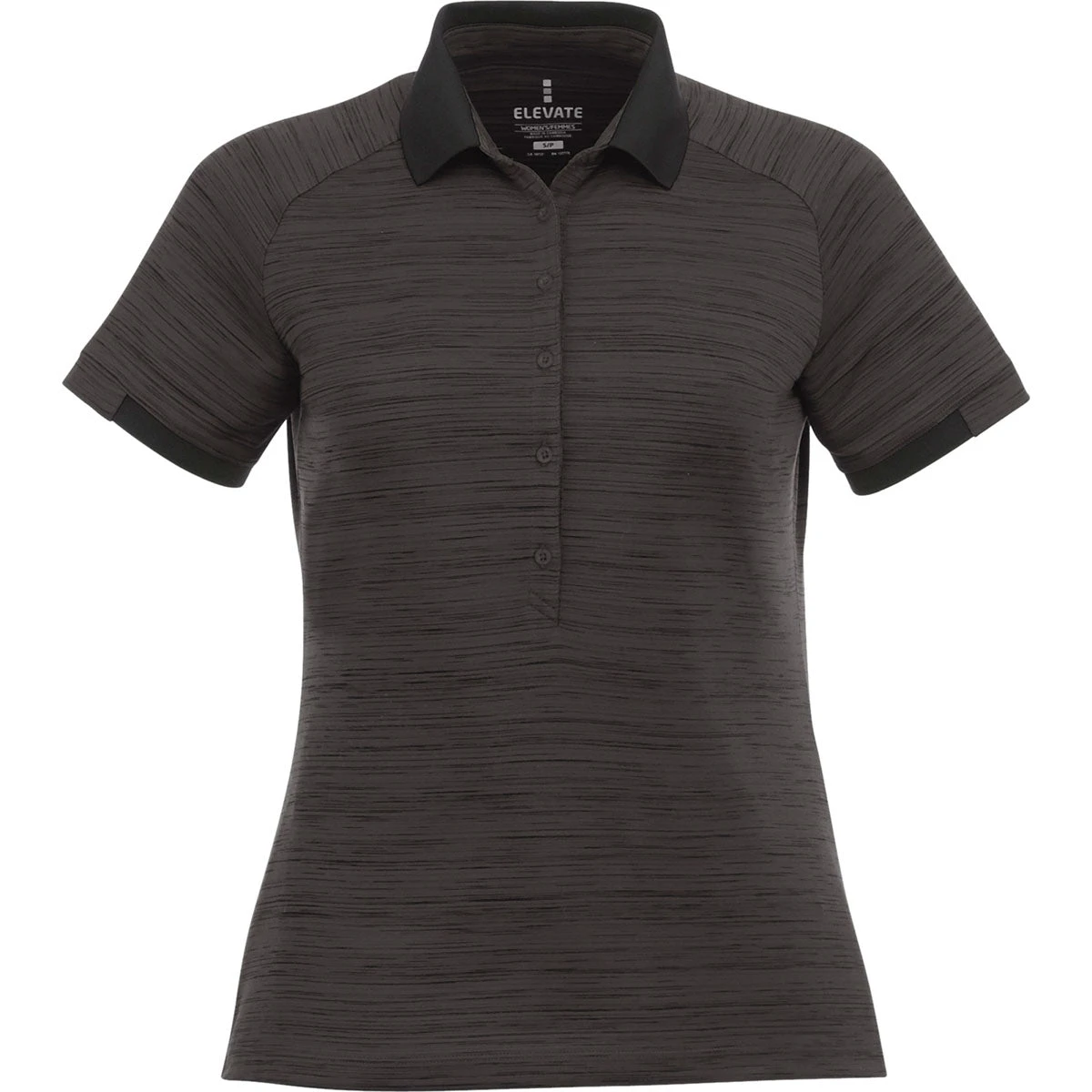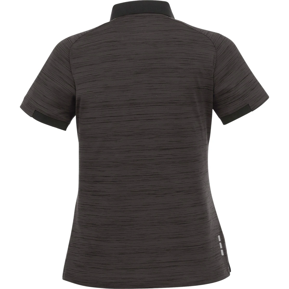 Give your female customers and employees a sophisticated, preppy look with this Elevate Women’s Black Smoke Heather/Black Emory Short Sleeve Polo shaped from micro polyester heather jersey peached knit. Cut for a feminine frame and sporting a classic silhouette, this polo gives them a versatile style that looks great as everyday vogue or at corporate get-togethers. Engineered with moisture wicking, the Emory polo is snag resistant with UV protection and an anti-microbial finish. Its contrasting rib sleeves provide a perfect location for your custom logo. Polo shirts adorned with a company logo given as gifts or giveaways are a great way to broadcast your name and build brand awareness.