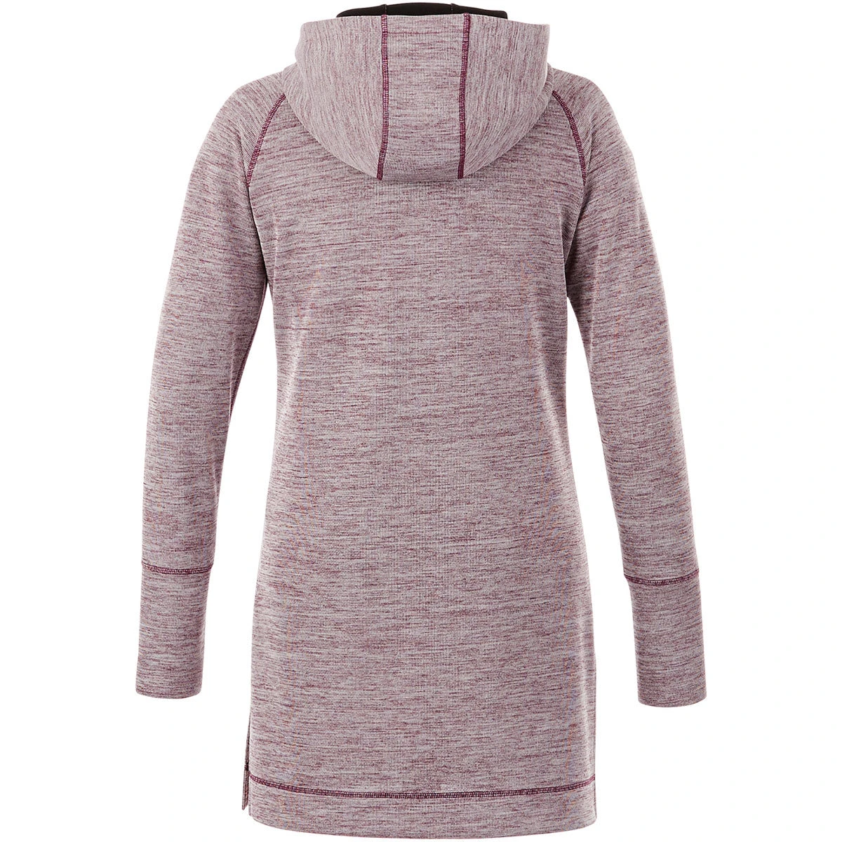 Elevate Women’s Maroon Heather Odell Knit Zip Hoody is not only on point, but comes in a functional tunic length for women who want to look and feel their best. Perfect as a corporate gift or as required employee apparel, no one will complain about this moisture wicking hoody with sleeve cuffs, ear bud cord guide, exit port, and thumb exits. Whether working in cold weather or taking part in a team building activity these hoodies with a custom logo will be a must have. Corporate embroidery is a great way to showcase your company while allowing everyone to look their best. Order several in one of four available colors and a range of sizes!