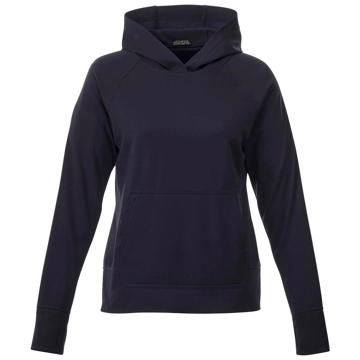 The cozy Elevate Women’s Navy Coville Knit Hoody can be custom logoed with your company name. Available in eight different eye-catching colors, this polyester jersey knit top offers must-have features such as a large front pocket and sleeve cuffs with thumb holes. Wear it with the hood down or put the hood up when the weather gets brisk and extra warmth is needed. This custom screen print hoody is sure to be a favorite with your employees. Order the hoody in bulk and make sure that each and every one of your faithful workers has this employee apparel to wear.